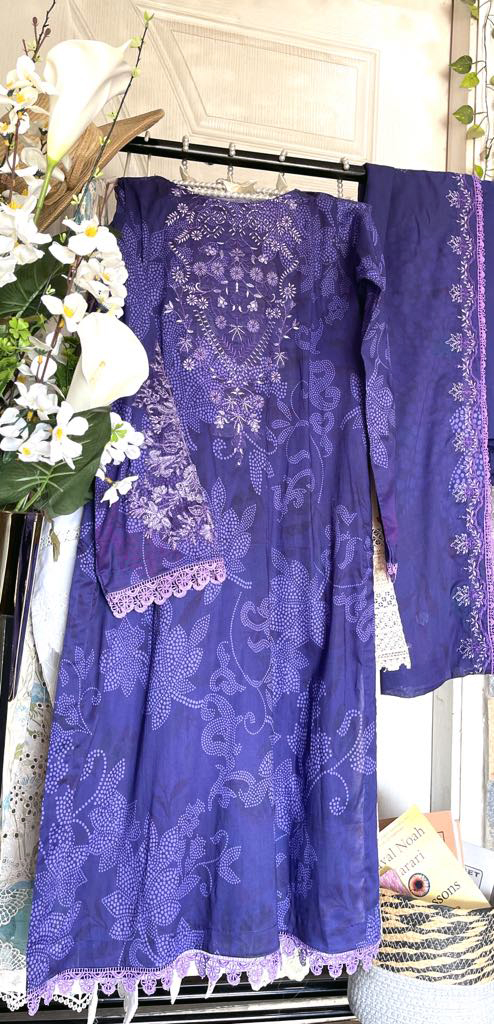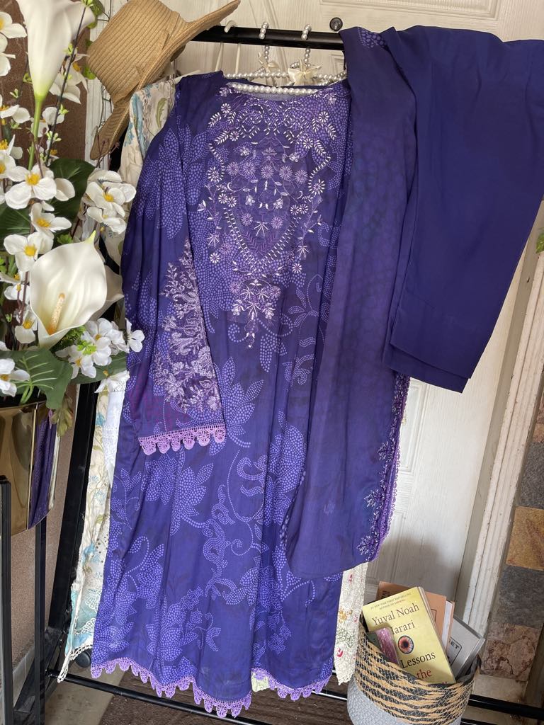 Embrace regal charm with our vibrant purple embroidered lawn dress, paired with a coordinating embroidered dupatta (size Medium). Perfect for festive celebrations, weddings, or special occasions, this 2-piece ensemble combines luxurious craftsmanship with breathable comfort. The all-over intricate embroidery on premium lawn fabric ensures a standout look, while the flowy dupatta adds graceful movement to your every step.